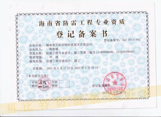 湖南普天科比特防雷技術(shù)有限公司防雷工程專業(yè)設(shè)計甲級資質(zhì)證編號:11182009046),總第11061,有效期至2013年05月26日已按規(guī)定程序在海南省氣象主管機構(gòu)進(jìn)行防雷工程專業(yè)設(shè)計、施工等級備案。有效期自2012年05月27日至2013年05月26日。