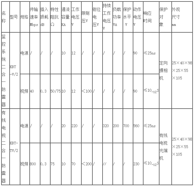 KBT-V2二合一監(jiān)控多功能防雷器采用BNC視頻接口,適用普通攝像機(jī)、固定攝像機(jī)、紅外機(jī)的防雷保護(hù)。電源工作電壓分24V(交、直流通用),信號(hào)工作電壓為6-12V。