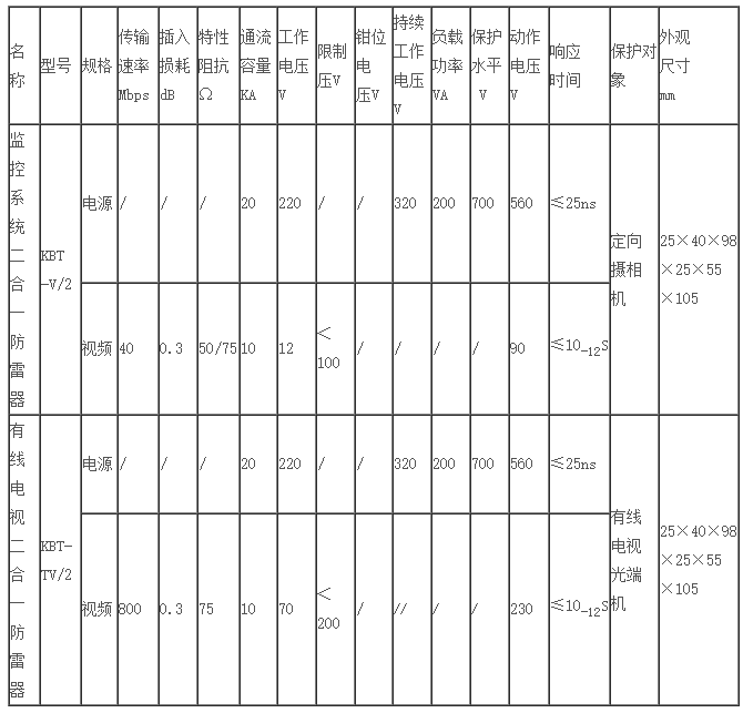 KBT-V2二合一監(jiān)控多功能防雷器采用BNC視頻接口,適用普通攝像機(jī)、固定攝像機(jī)、紅外機(jī)的防雷保護(hù)。電源工作電壓分24V(交、直流通用),信號(hào)工作電壓為6-12V。