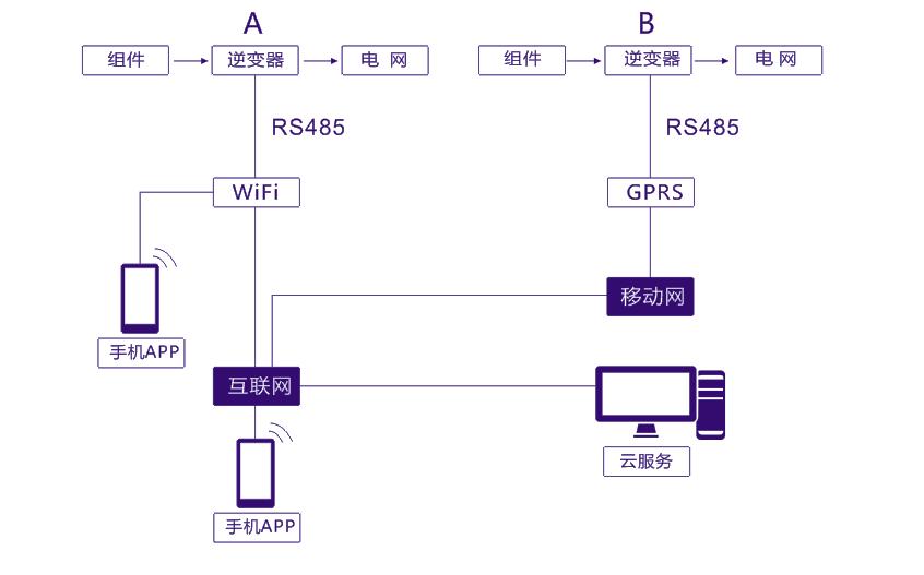 戶用型智能逆變器中配套WIFI無線通信模塊,與家用無線路由即可通過手機或PC實時對逆變器的運行情況進行監(jiān)控。也可通過通信運營商提供的無線上網模塊(GPRS/CDMA等)實現(xiàn)遠程手機APP監(jiān)控。